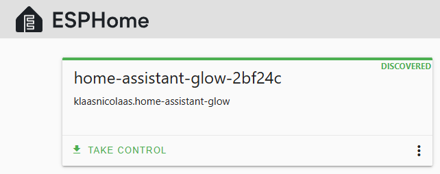 Before making any changes to the firmware, you first need to adopt the device into the ESPHome. Once your ESPHome Builder is up and running, and the Glow is connected to your local network, you should see an option to Take Control of the device.
